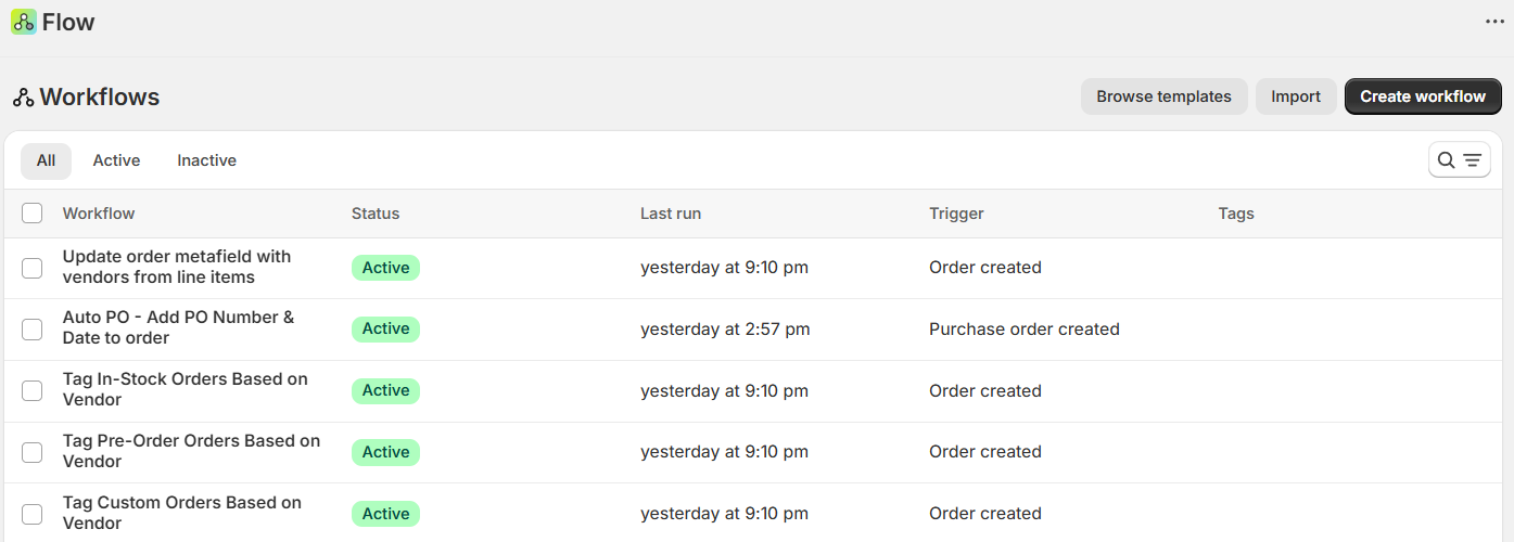 We built a Shopify-native order tracking system using a combination of order metafields, Shopify Flow automations, and Better Reports dashboards. The Flows automatically tag and categorise incoming orders (custom, pre-order vs. in-stock), assign vendors, log key dates like PO creation and fulfilment, and route orders through the correct workflow. Better Reports provides the team with a suite of dashboards including a main custom orders tracker, an overdue orders morning checklist, vendor-specific views, and payment balance reports — all with scheduled daily and weekly email summaries sent directly to the team.